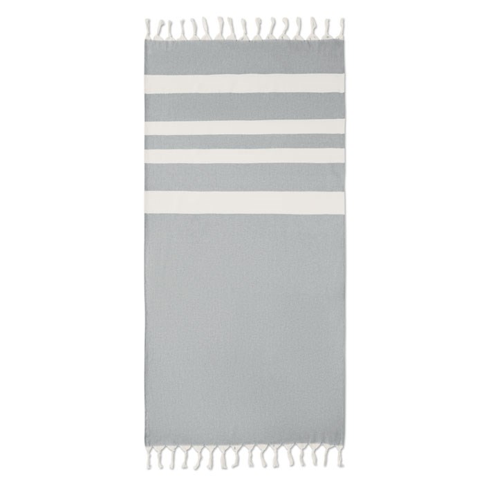 Strandtuch/Hamamtuch aus recycelten Stoffen: recycelter Baumwolle (45%) und recyceltem Polyester (55%). . 140 g/m².
