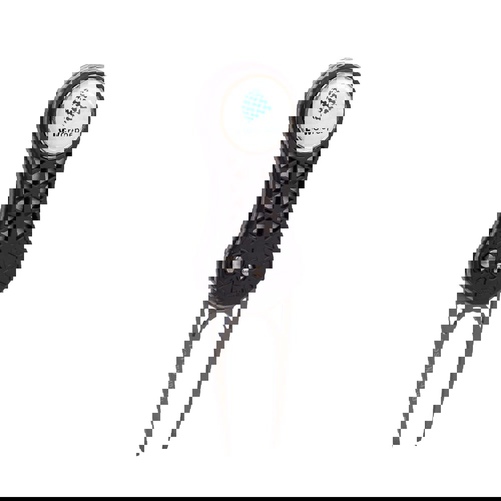 Leichte Pitchgabel aus Aluminium mit Kunststoffgehäuse und automatischem klappsystem, inkl. magnetischem Golfballmarker mit Doming und großem Doming an der Rückseite