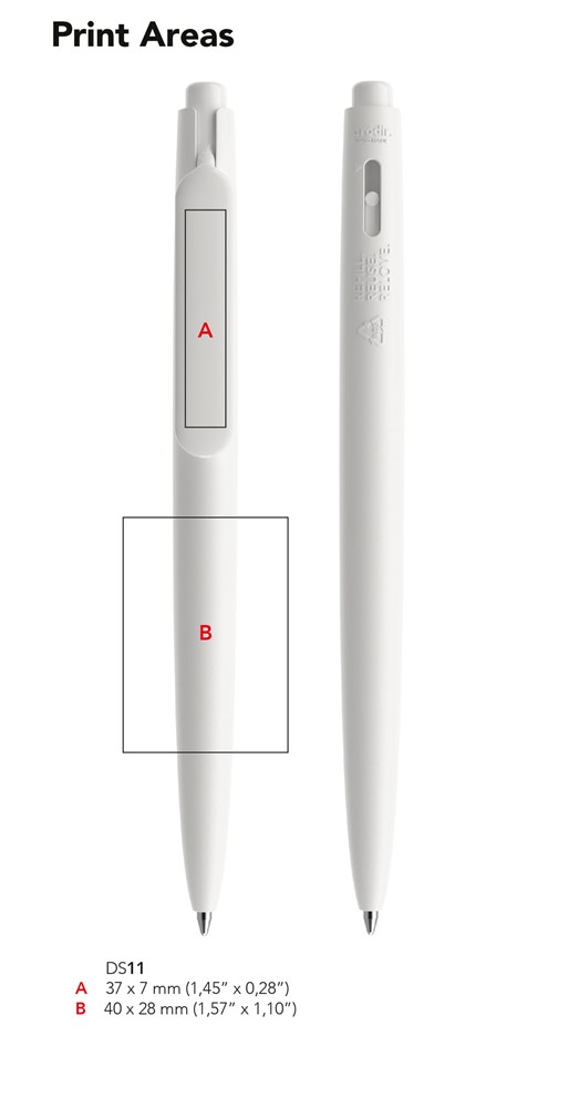 Druckkugelschreiber mit Gehäuse aus 100% recyceltem Kunststoff (ABS) in den Farben Weiss und Schwarz und aus 50% recyceltem Kunststoff in allen anderen Farben. Standardversionen in zehn matten Farben verfügbar. Sonderfarben nach PMS bereits ab 5.000 Stück erhältlich. Oberflächenmix bei Clip und Gehäuse. Clip in zehn polierten Farben. Zwei Druckflächen, Clip in bis zu sechs Farben bedruckbar.