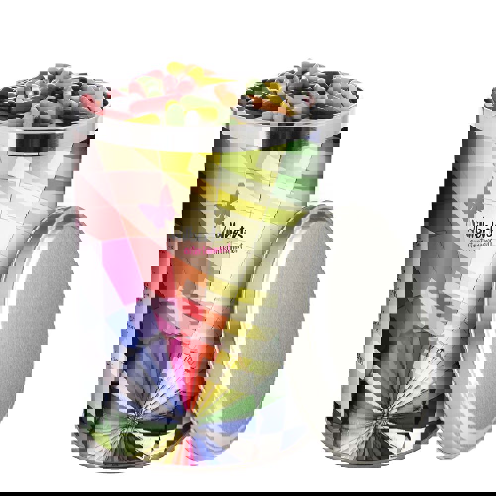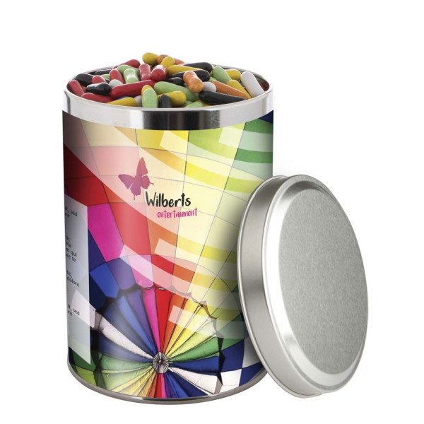 Große 1,3 Liter Dose mit einer vollfarbig bedruckten Banderole und gefüllt mit ca. 485 Gramm Metallic Sweets