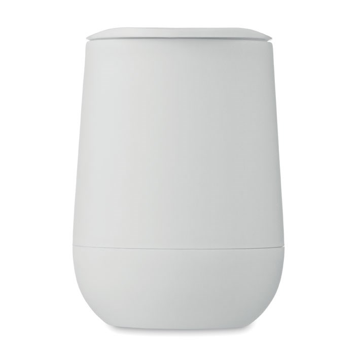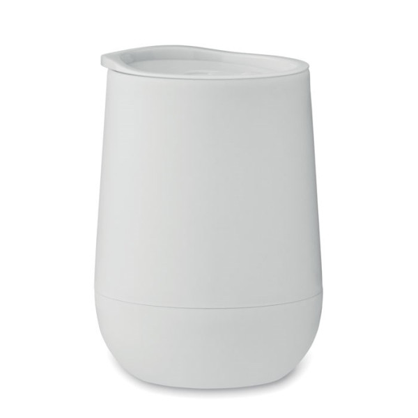 Doppelwandiger Becher aus PP. Trinköffnung im Deckel aus PS und ABS. Füllmenge: 300 ml.