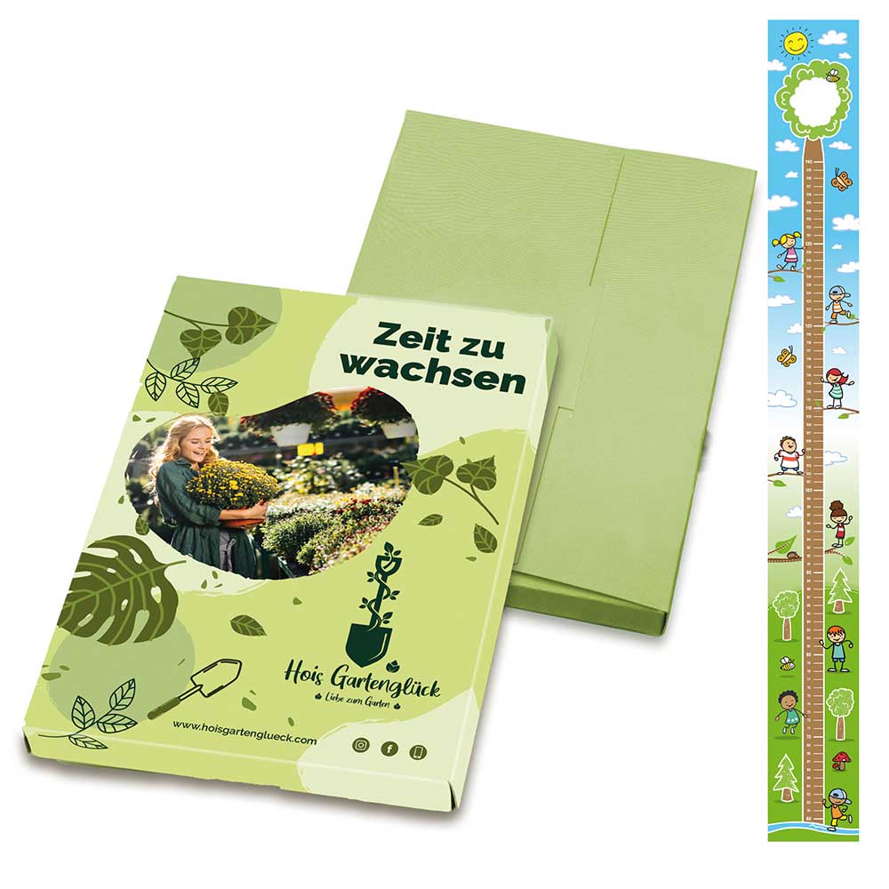 Mit der Kindermesslatte aus bunt bedrucktem Karton können Eltern auf eine einfache Weise das Wachstum ihrer Kinder dokumentieren. Der Messbereich reicht von 60 bis 140 cm und bietet somit eine lange Nutzbarkeit. Die Messlatte ist im handlichen DIN A6-Format gefaltet und lässt sich praktisch verstauen. Das Set wird in einer hochwertig gestalteten Mappe geliefert.