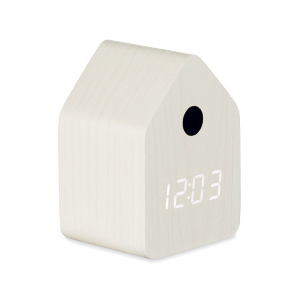 Kleine Tischuhr aus MDF mit Weckfunktion und Temperaturanzeige. Der Kuckucksruf ertönt zur vollen Stunde sowie als Weckruf. Automatische Nachtabschaltung des Stundentons zwischen 22:00 und 06:00 Uhr. Snooze-Funktion. Weiße LED-Anzeige.