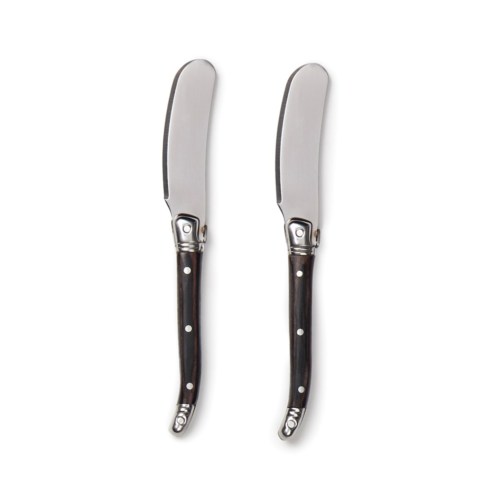Exclusive 2-piece stainless steel butter knife set. These knives are perfect for spreading butter or jam on toast, bagels, muffins and more. The high-quality stainless steel blades ensure a smooth and effortless spread, while the sturdy pakka wood handles provide a comfortable grip. The set comes packed in an exclusive gift box, making it an ideal gift for any occasion.
