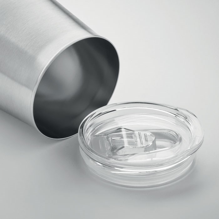 Recycled stainless steel (90% recycled stainless and 10% stainless steel) powder coated mug with lid with sliding sip hole cover. Capacity: 500 ml. As this is a single walled mug heat transfer can still occur.