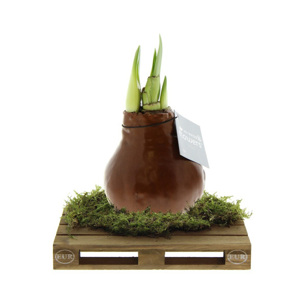 No Water Flowers® zijn een luxe, groeiend en bloeiend geschenk. De levende No Water Flowers® staan bekend om de unieke handgemaakte wax amaryllisbollen. Deze speciaal geselecteerde en geteste amaryllisbollen hebben genoeg energie om zonder water te groeien en te bloeien. Authentieke No Water Flowers® geven vrij korte bloemstelen, vallen niet om en bloeien gegarandeerd. Iedere No Water Flowers® wordt zorgvuldig schoongemaakt en tot in perfectie gewaxt. Dit geeft de bloembol een eigentijdse en modieuze uitstraling. Deze No Water Flowers® is geplaatst op een gaaf mini palletje wat een stoere en gave verschijning is. Super tof voor bijvoorbeeld de logistieke sector. Bovendien zorgt dit ervoor dat de amaryllisbol extra stevig staat.