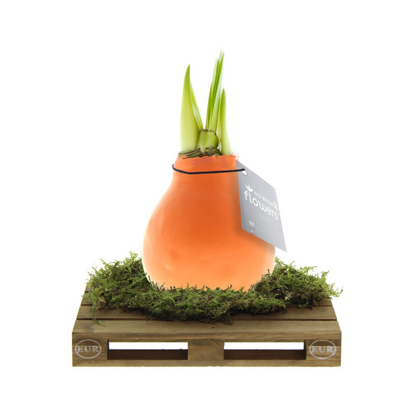 No Water Flowers® zijn een luxe, groeiend en bloeiend geschenk. De levende No Water Flowers® staan bekend om de unieke handgemaakte wax amaryllisbollen. Deze speciaal geselecteerde en geteste amaryllisbollen hebben genoeg energie om zonder water te groeien en te bloeien. Authentieke No Water Flowers® geven vrij korte bloemstelen, vallen niet om en bloeien gegarandeerd. Iedere No Water Flowers® wordt zorgvuldig schoongemaakt en tot in perfectie gewaxt. Dit geeft de bloembol een eigentijdse en modieuze uitstraling. Deze No Water Flowers® is geplaatst op een gaaf mini palletje wat een stoere en gave verschijning is. Super tof voor bijvoorbeeld de logistieke sector. Bovendien zorgt dit ervoor dat de amaryllisbol extra stevig staat.