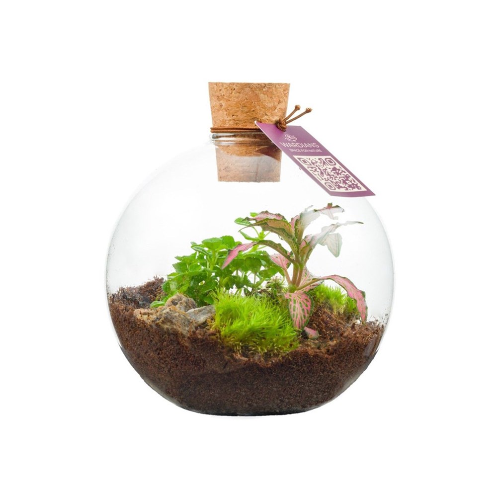 Kies voor een uniek en gepersonaliseerd plantenterrarium met jouw logo als zakelijk relatiegeschenk, waar de ontvanger langdurig van geniet. Dit kleine, ronde model zorgt voor een sfeervolle groene touch op elk bureau. Onze Wardians® ecosystemen bevatten prachtige levende planten in een glazen terrarium, afgesloten met kurk. Een ecosysteem of plantenterrarium creëert een zelfregulerend mini-biotoop waarin levende organismen samenwerken om alles te recyclen. Hierdoor kunnen de planten gedijen zonder externe verzorging. Zo heeft de ontvanger van dit groene cadeau er nauwlijks onderhoudt aan, maar wél langdurig plezier van.