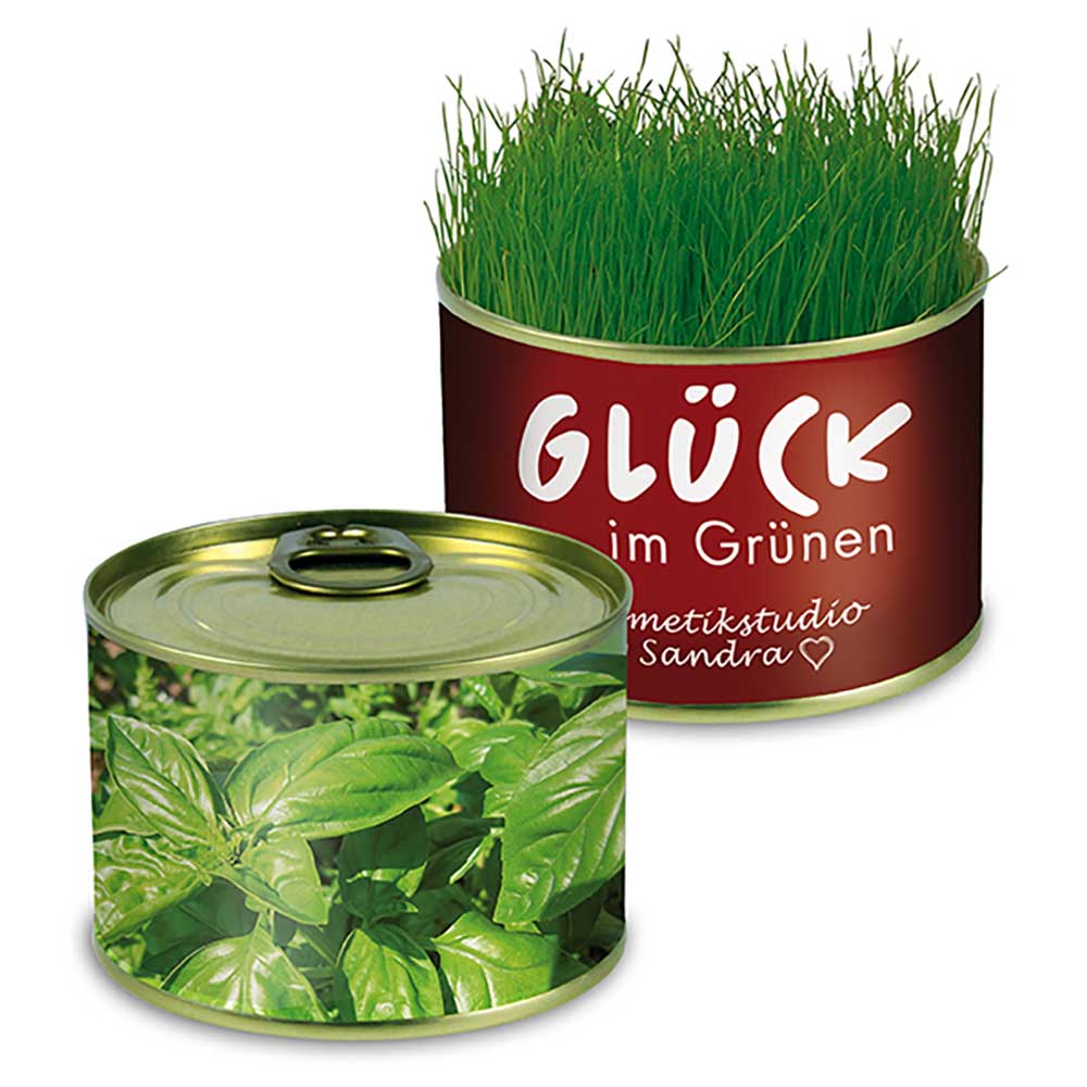 Blik met zaadjes, veel keuze aan bloemen en kruiden. een potgrond tablet wordt meegeleverd. De wikkel is groot genoeg voor uw logo of tekst en geeft dit blikje een uniek karakter met zaden - Basilicum