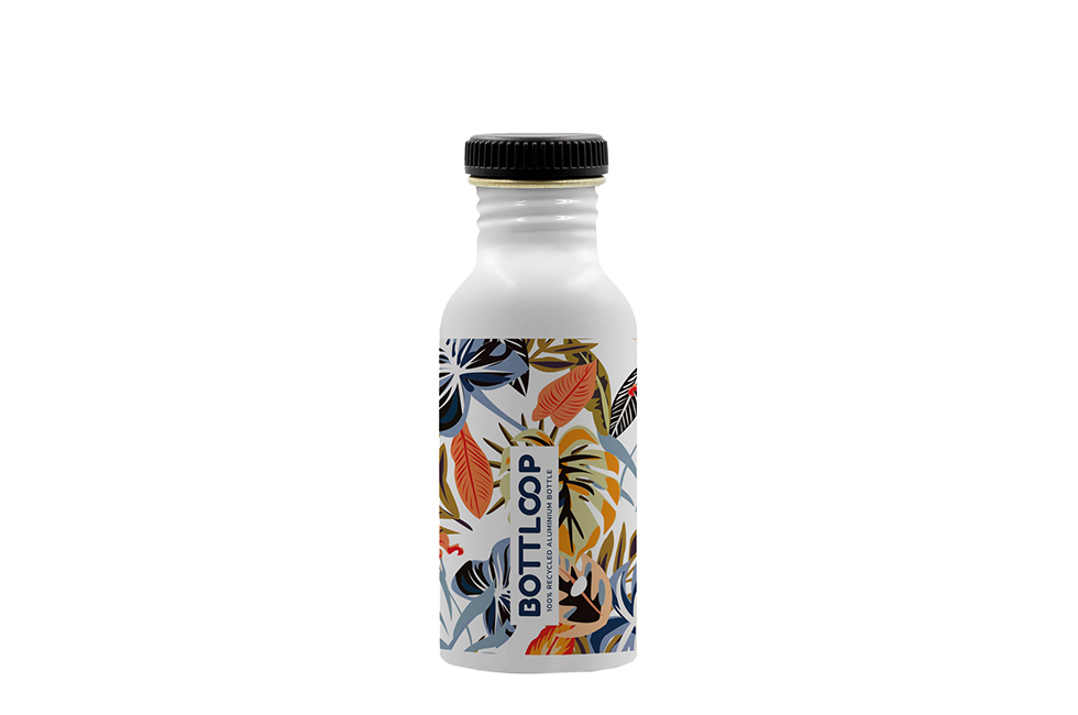 De Bottloop is een enkelwandige fles (0,6L) die gemaakt is van 100% gerecycled PCR (Post-Consumer Recycled) aluminium. Het aluminium wordt gerecycled in Slovenië en werd voorheen gebruikt voor consumentenproducten, auto's en blikjes. In elke PMS kleur leverbaar.