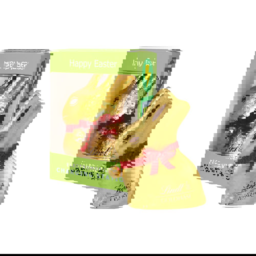 Lindt melkchocolade paashaas van ca. 50 gram in een all-over full colour bedrukt doosje
